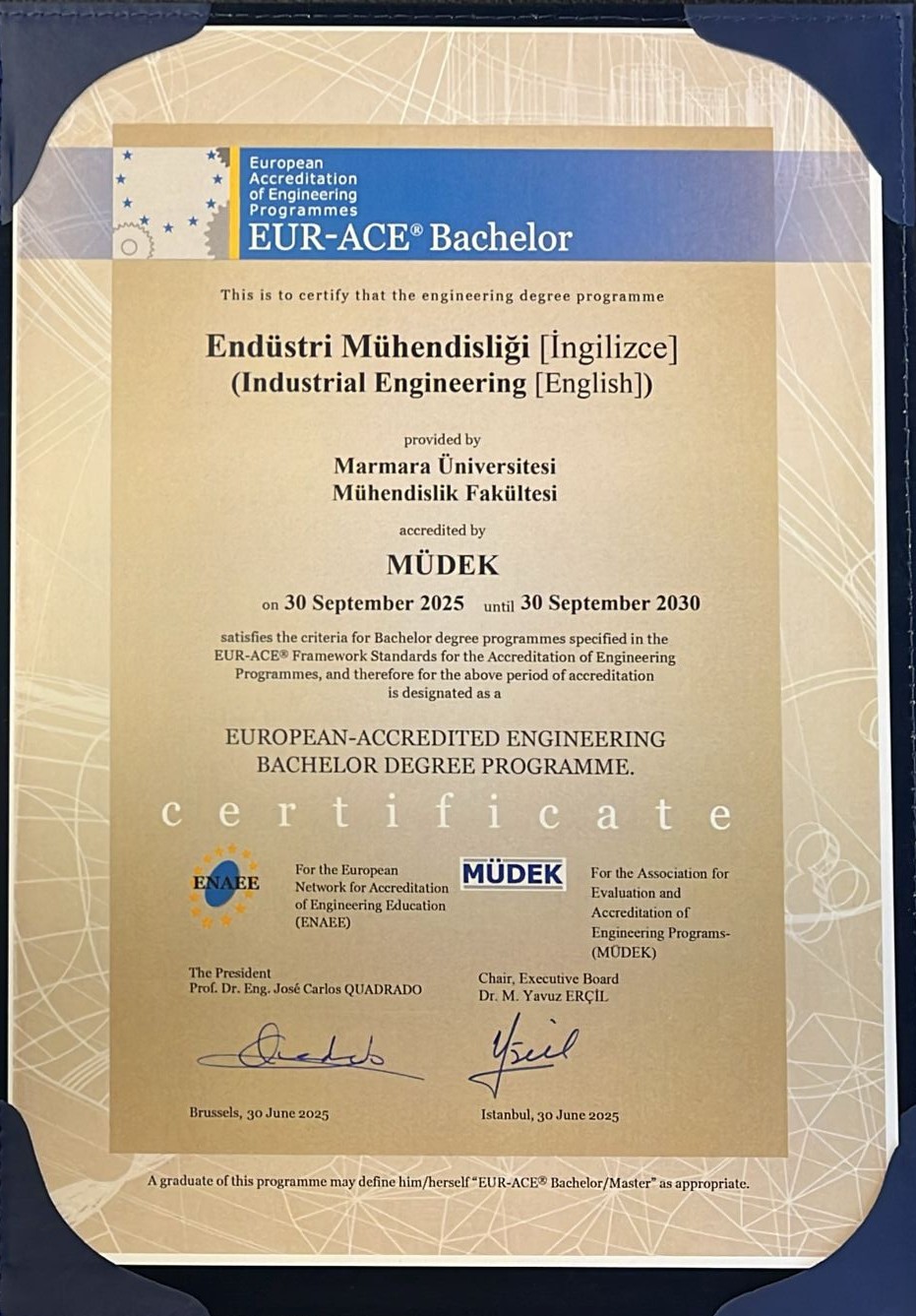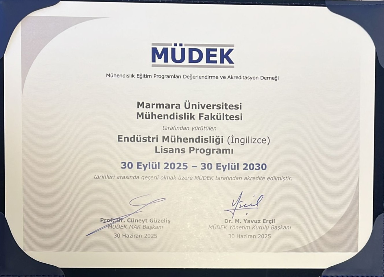 ‘Mühendislik Eğitim Programları Değerlendirme ve Akreditasyon Derneği’ (MÜDEK) tarafından yapılan değerlendirmeler sonucu akreditasyon belgemizin geçerliliğinin 2030 yılına kadar uzatılması uygun bulunmuştur.